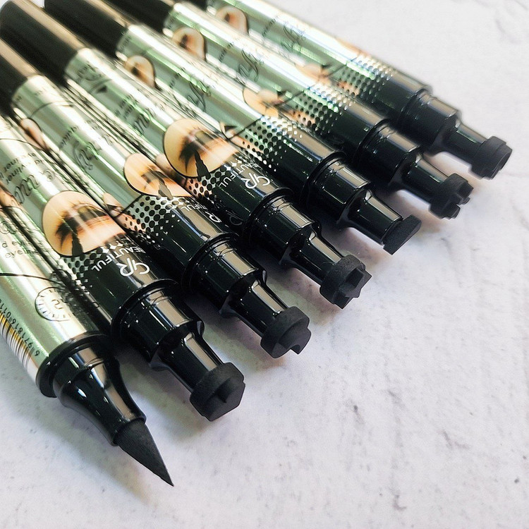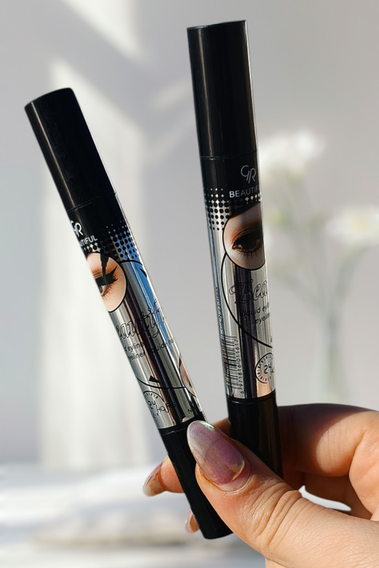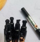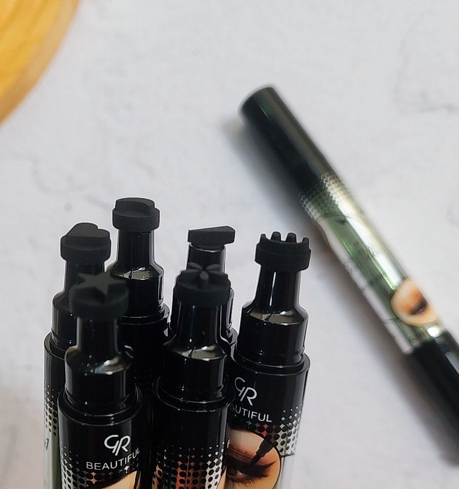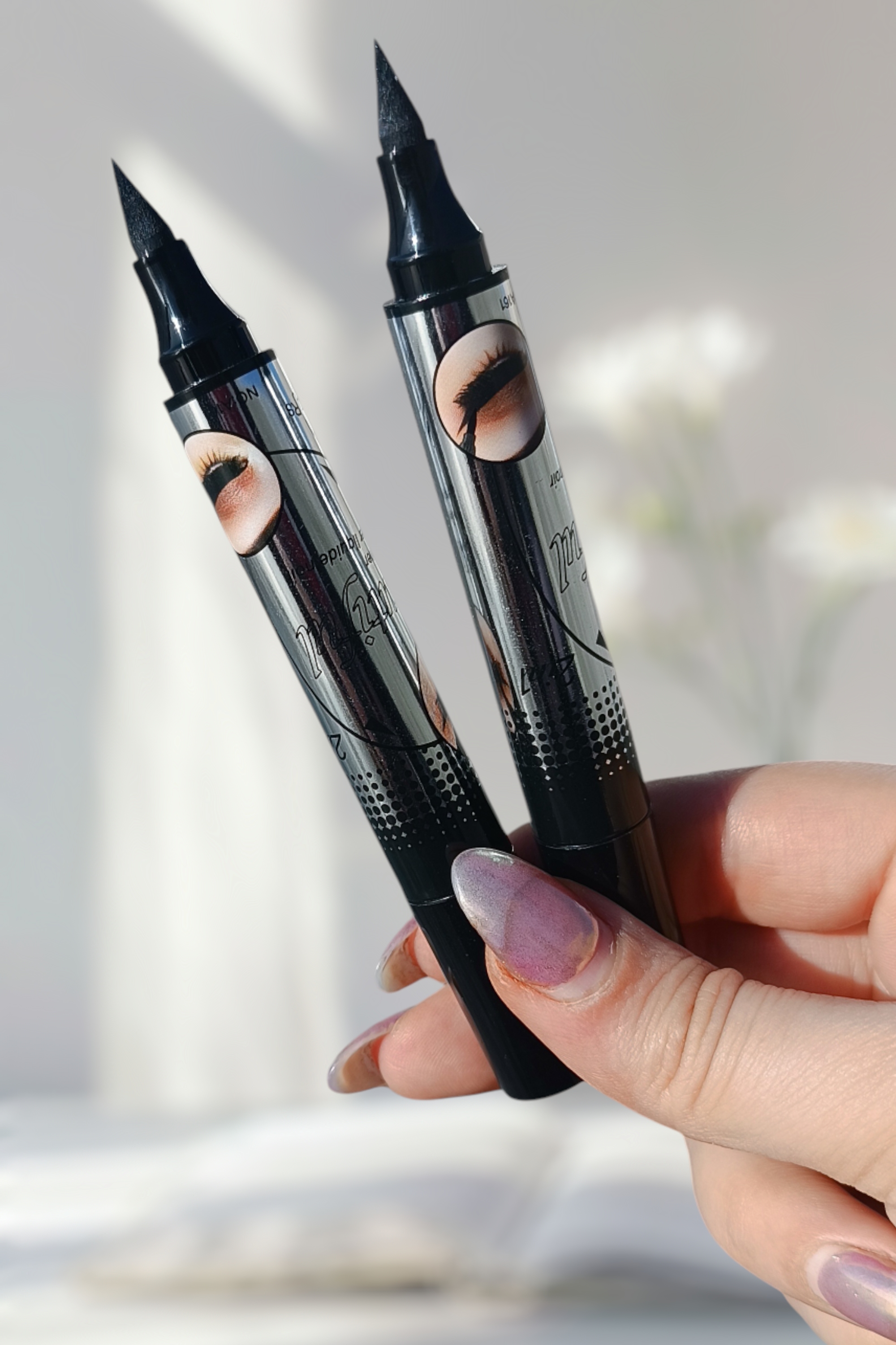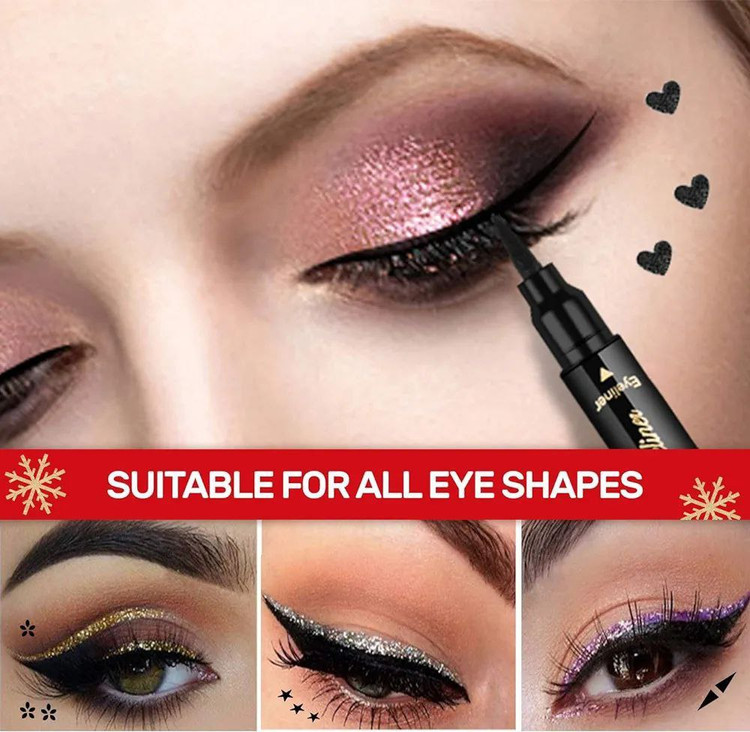 - خط چشم ماژیکی دوطرفه با طراحی خاص و استامپی، به شما این امکان را میدهد که با یک حرکت ساده، آرایشی خلاقانه و چشمگیر داشته باشید. یک سمت این خط چشم نوک ماژیکی باریک برای کشیدن خط دقیق است و سمت دیگر استامپ قلب یا گل دارد که برای طراحیهای فانتزی استفاده میشود.